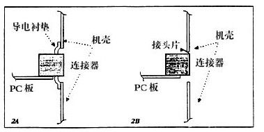 屏蔽連接器方法有,加指形簧片或墊片。連接器的搭接,是在連接器和機殼之間填滿空處。這個方法要求有一個襯墊(圖2A)。金屬襯墊較好,只要處理合適,也就是說,只要表面不被污染,只要手不觸及或損壞襯墊以及只要有足夠的壓力,以保持好的、低阻抗的接觸。