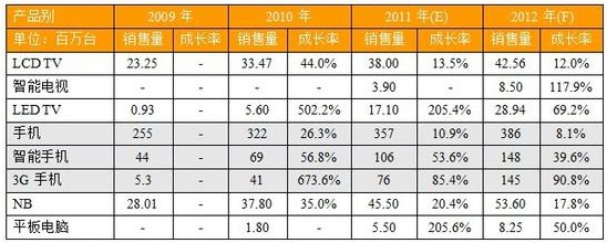 2012年中國大陸主要消費電子產(chǎn)品銷售量預(yù)估