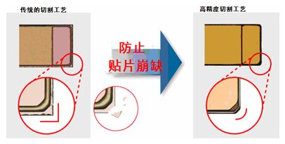 近年來(lái),智能手機(jī)市場(chǎng)的需求迅猛增長(zhǎng),多功能化使手機(jī)產(chǎn)品的零部件數(shù)量增加,因此,可高密度安裝的超小型零部件的需求隨之增加。但是,以現(xiàn)有的制造技術(shù),切割工藝中的封裝尺寸公差較大,達(dá)±20μm,不僅如此,還存在貼片崩缺等各種課題,業(yè)內(nèi)認(rèn)為0402尺寸以下的開(kāi)發(fā)是非常困難的。