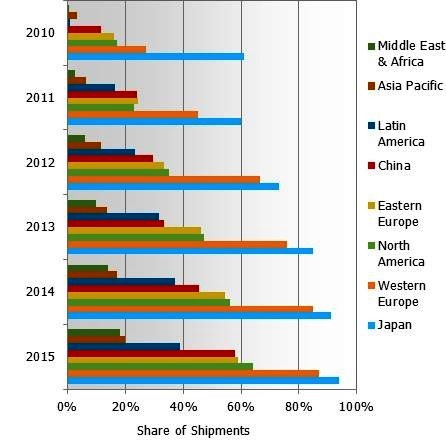 2010~2015年全球連網(wǎng)電視出貨比例,按區(qū)域市場