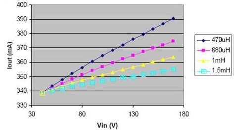 上圖是不同電感值下的頻率響應。下圖說明了電感減小時,在輸入電壓的變化范圍內,負載電流的變化明顯增大。