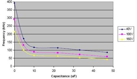 輸出可同時使用輸出電容以達到目標頻率和電流的精確控制。電容能在整個輸入電壓范圍內減小頻率,一個小的 4.7μF 的電容就能顯著減小頻率。電流的調整也能因為電容值的增加而得到改善。從下面圖片可以很容易看到,圖上存在一個拐點,再增加電容值,對操作頻率和輸出電流的調整影響不大。