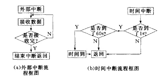 為了確保主機(jī)正常工作。加入主機(jī)等待分機(jī)回復(fù)的等待時(shí)間。而為了時(shí)間的實(shí)時(shí)性和準(zhǔn)確性,用到單片機(jī)內(nèi)部的定時(shí)器1.設(shè)定其工作模式為模式1,初值為Ox4bff(5Oms)。中斷20次為1s,60次循環(huán)為60s,當(dāng)60s到時(shí),標(biāo)志位置位后返回。時(shí)間中斷流程圖如圖7(b)所示。