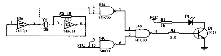 紅外發(fā)送器電路如圖3所示包括38kHz晶體振蕩器、反相器、與非門、驅(qū)動(dòng)門Q1和紅外發(fā)射管D1等部分。其中38kHz晶體振蕩器、電阻R3和反相器組成脈沖振蕩器,用以產(chǎn)生38kHz的脈沖序列作為載波信號(hào),紅外發(fā)射管D1選用Vishay公司生產(chǎn)的TSAL6238,用來(lái)向外發(fā)射950nm 的紅外光束。
