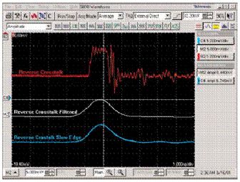 藍(lán)色波形是由白色波形濾波后減緩了脈沖上升沿得到的波形,它代表的就是對(duì)串?dāng)_進(jìn)行后濾波的結(jié)果。圖中顯示的紅色和藍(lán)色兩個(gè)串?dāng)_波形是以相同的電壓刻度顯示的。
