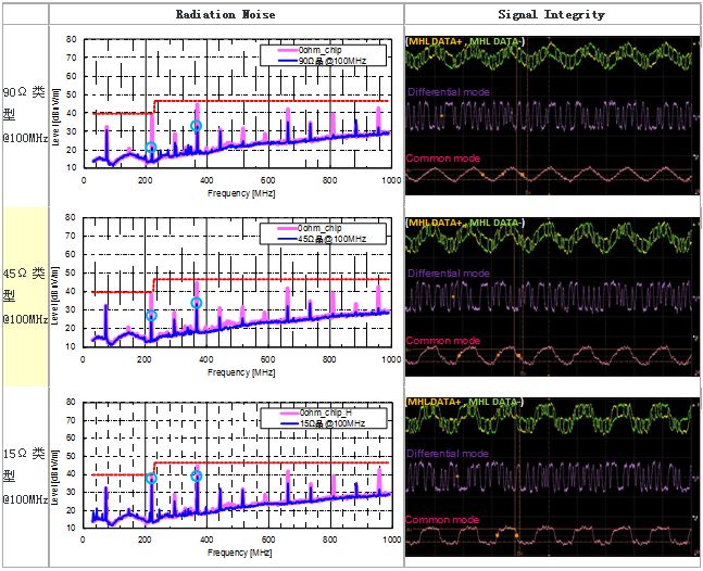 圖5:MHL信號線使用各種共模扼流線圈時的輻射噪聲/信號波形評測結(jié)果