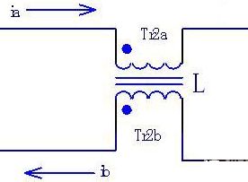 圖1所示的是共模電感的濾波電路,Tr2a和Tr2b就是共模電感L的兩個(gè)線圈。這兩個(gè)線圈繞在同一磁芯上,匝數(shù)和相位都相同。這樣,當(dāng)電路中流過(guò)電流ia和ib的大小相同、方向相反時(shí),電流在同相位繞制的電感線圈中產(chǎn)生反向的磁場(chǎng)而相互抵消,磁芯中沒(méi)有交變的磁通量產(chǎn)生。