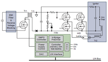 安森美半導(dǎo)體的全功能高強(qiáng)度放電(HID)(或氙燈)專用集成電路有助于改善前燈系統(tǒng)的性能。相對(duì)于傳統(tǒng)的鹵素?zé)?,HID改善了顯色性,降低了功耗,使用壽命更長(zhǎng),光輸出更高。為了支持其先進(jìn)的功能,需要高效率的HID大燈鎮(zhèn)流器和復(fù)雜的控制電路。安森美半導(dǎo)體的HID燈控制系統(tǒng)是采用8位微控制器或?qū)S脿顟B(tài)機(jī)的混合模擬/數(shù)字解決方案,它集成了DC-DC控制器,具備全面的診斷功能(過壓、欠壓、溫度傳感器、續(xù)航時(shí)間計(jì)數(shù)器)、各種通信接口(LIN、SPI),支持35 W(D1/D2/D3/D4)和25 W(D5)燈。圖3為該專用集成電路的框圖。