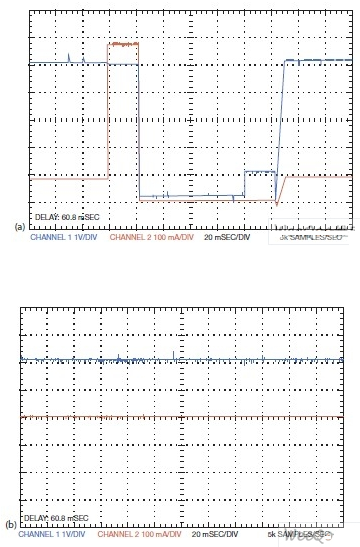 圖2顯示了保護功能的作用過程。輸出B有一個300mA的恒定負(fù)載,輸出A則在100mA負(fù)載和600 mA負(fù)載之間切換。當(dāng)出現(xiàn)一個過載時,輸出A被關(guān)斷,但有一個20 ms的延遲,以避免對短時的瞬流作出響應(yīng)(圖2a)。電路在80 ms后消除過載;再經(jīng)過20 ms的延遲,自動重啟功能使輸出A重新連線。輸出B根本察覺不到輸出A的問題(圖2b)。不過,故障指示輸出端變?yōu)榈?,表示通道A有一個問題。