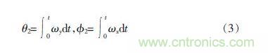 若使用陀螺儀來(lái)測(cè)量平衡車姿態(tài)角度,設(shè)陀螺儀測(cè)量載體相對(duì)慣性坐標(biāo)系的x、y、z 三軸旋轉(zhuǎn)角速度分別為ωx、ωy、 ωz。并定義0 時(shí)刻平衡車直立靜止??傻玫礁┭鼋?theta;2和橫滾角φ2估計(jì)值與ωx、ωy之間的關(guān)系如式3 所示: