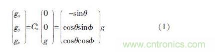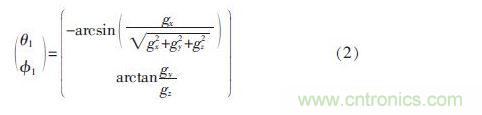 其中,Cbn為慣性坐標(biāo)系到載體坐標(biāo)系的變換矩陣;θ 為俯仰角;φ為橫滾角;g 為重力加速度; 可以通過(guò)測(cè)量重力加速度分量gx、gy、gz,計(jì)算出平衡車俯仰角θ1和橫滾角φ1估計(jì)值