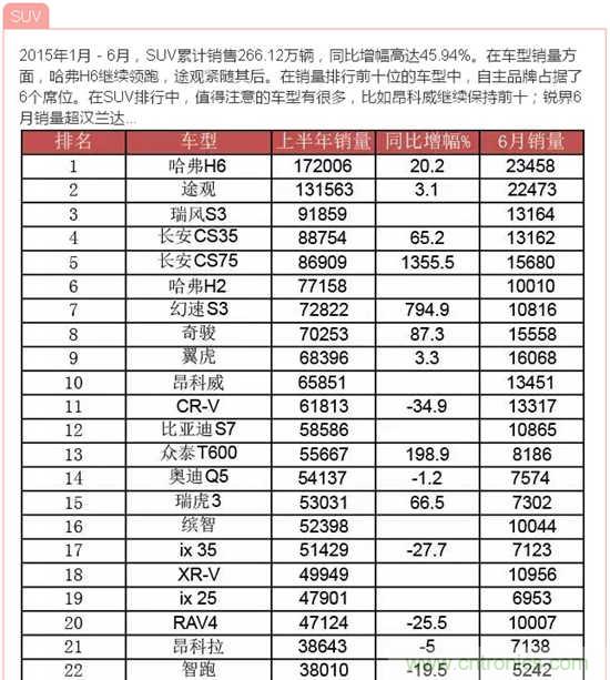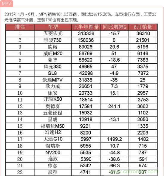 據(jù)中國汽車工業(yè)協(xié)會(huì)發(fā)布的數(shù)據(jù),2015年6月,汽車產(chǎn)銷量環(huán)比下降,同比繼5月后再次雙雙下降;上半年,汽車產(chǎn)銷增速比上年同期明顯回落。說到汽車,小編想到了由我愛方案網(wǎng)承辦的“創(chuàng)業(yè)之星”2015全球創(chuàng)客大賽成都賽場中的一個(gè)參賽項(xiàng)目:智能車載太陽能轉(zhuǎn)化防護(hù)裝置,它改變?cè)扔扇斯ふ周囐M(fèi)時(shí)費(fèi)力方法,完全達(dá)到遙控自動(dòng)罩車,屬于汽車產(chǎn)品領(lǐng)域的一項(xiàng)新技術(shù),歡迎大家到淘方案上了解詳情!下面跟著小編來看看中國汽車在2015年1月-6月的銷量數(shù)據(jù)!歡迎參與互動(dòng)分享!