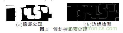 對(duì)于液晶屏圖像,考慮采用霍夫變換的方法求其傾斜角。通過(guò)霍夫變換,可以取得圖像中所有直線的端點(diǎn)。為了便于快速、高效地求取圖像的傾斜角,先對(duì)圖像進(jìn)行膨脹處理和邊緣檢測(cè)。