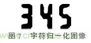 得到字符在圖像中的位置后,即可將字符從圖像中分割出來(lái)。由于實(shí)際分割過(guò)程中每個(gè)字符大小不一致,如圖6所示,所以對(duì)分割字符進(jìn)行歸一化處理,使不同字符的大小統(tǒng)一為固定大小,便于后續(xù)字符分割。首先將圖6中字符周?chē)目瞻孜恢们谐?,然后采用三次樣條插值的方法,對(duì)源圖像附近的4×4個(gè)鄰近像素進(jìn)行三次樣條擬合,最后將目標(biāo)像素對(duì)應(yīng)的三次樣條值作為目標(biāo)圖像對(duì)應(yīng)像素點(diǎn)的值。將字符歸一化以后,所得各個(gè)字符如下圖7所示。