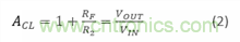 等式中A_CL是閉環(huán)增益,R_F 是反饋電阻值,而R_2 是從負(fù)輸入端到信號(反相)或接地(非反相)的電阻值。