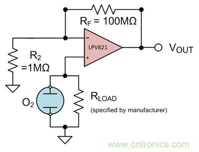 用氧氣傳感(見圖 3) 作為具體的應(yīng)用實例,假設(shè)感應(yīng)器的最大輸出電壓為10mV(通過制造商指定的負(fù)載電阻將電流轉(zhuǎn)換成電壓R_L) ,則運算放大器的滿量程輸出電壓為1V。通過Equation 2,可以看出 A_CL 的值需要為100,或者R_F是R_2的100倍。分別選擇100MΩ電阻和1MΩ電阻,得出增益值為101,且電阻值足夠大到可以限制電流并最小化功耗。