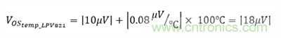 為最小化偏移誤差,LPV821零漂移毫微功耗運算放大器是一款理想器件。 使用Equation 5并假設(shè)操作溫度范圍為0°C—100°C,該器件產(chǎn)生的最大偏移誤差為: