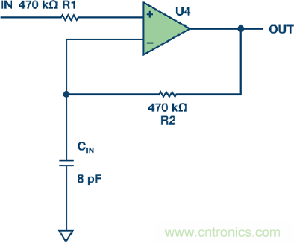 所有運(yùn)算放大器都有一定的輸入電容,包括差分和共模。如果運(yùn)算放大器連接為跟隨器,并且在反饋路徑中放入一個(gè)電阻以平衡阻抗,那么系統(tǒng)可能容易發(fā)生振蕩。原因是:大反饋電阻、運(yùn)算放大器的輸入電容和PC板上的雜散電容會(huì)形成一個(gè)RC低通濾波器(LPF)。此濾波器會(huì)引起相移,并降低閉環(huán)系統(tǒng)的相位裕量。如果降低得太多,運(yùn)算放大器就會(huì)振蕩。一位客戶(hù)在一個(gè)1 Hz Sallen-Key低通濾波器電路中使用AD8628 CMOS運(yùn)算放大器。由于轉(zhuǎn)折頻率較低,電阻和電容相當(dāng)大(參見(jiàn)圖3)。輸入電阻為470 kΩ,所以客戶(hù)在反饋路徑中放入一個(gè)470 kΩ電阻。此電阻與8 pF的輸入電容(參見(jiàn)圖4)一起提供一個(gè)42 kHz極點(diǎn)。AD8628的增益帶寬積為2 MHz,因此它在42 kHz仍有大量增益,它發(fā)生了軌到軌振蕩。把470 kΩ電阻換成0 Ω跳線即解決了問(wèn)題。因此,反饋路徑中應(yīng)避免使用大電阻。這里,何者為大取決于運(yùn)算放大器的增益帶寬。對(duì)于高頻運(yùn)算放大器,例如增益帶寬超過(guò)400 MHz的ADA4817-1,1 kΩ反饋電阻就稱(chēng)得上是大電阻。務(wù)必閱讀數(shù)據(jù)手冊(cè)以了解其中的建議。