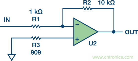 電阻熱噪聲的計(jì)算公式為√4kTRB,故1 kΩ電阻會(huì)有4 nV/√Hz的噪聲。增加電阻會(huì)增加噪聲。在圖2中,出人意料的是,雖然909 Ω補(bǔ)償電阻是值最低的電阻,但由于從該節(jié)點(diǎn)到輸出端的噪聲增益,它給圖2輸出端貢獻(xiàn)的噪聲最多。R1引起的輸出噪聲為40 nV/√Hz,R2為12.6 nV/√Hz,R3為42 nV/√Hz。因此,請(qǐng)勿使用電阻。另一方面,如果運(yùn)算放大器采用雙電源供電,并且一個(gè)電源先于另一個(gè)電源上電,那么ESD網(wǎng)絡(luò)可能發(fā)生閂鎖問(wèn)題。這種情況下,可能希望增加一定的電阻來(lái)保護(hù)器件。但若使用的話,應(yīng)在電阻上放置一個(gè)旁路電容以減少電阻的噪聲貢獻(xiàn)。