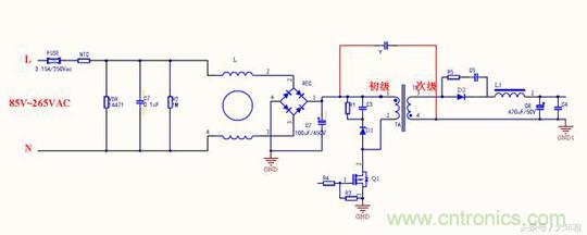 變壓器的每個線圈繞組之間有寄生電容存在,在工作時過程當中形成電壓,成為噪聲源頭,在初始高壓與次級地之間跨接Y電容,能濾除初級和次級耦合產(chǎn)生的共模干擾,這與第一種差不多,只是在EMI測試時候結(jié)果會有所不同。