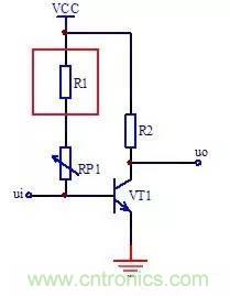 電阻R1用來(lái)限制電路中電流,防止可變電阻器阻值調(diào)到最小時(shí),使得三極管VT1基極電壓等于電源電壓VCC,那樣會(huì)因?yàn)閂T1基極電流太大而損壞VT1,這種電阻在電路中一般稱(chēng)為保護(hù)電阻。