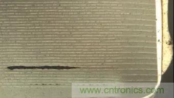 熱沖擊主要發(fā)生在波峰焊時(shí),溫度急劇變化,導(dǎo)致電容內(nèi)部電極間出現(xiàn)裂縫,一般需要通過測量發(fā)現(xiàn),研磨后觀察,通常是較小的裂縫,需要借助放大鏡確認(rèn),少數(shù)情況下會(huì)出現(xiàn)肉眼可見的裂縫。