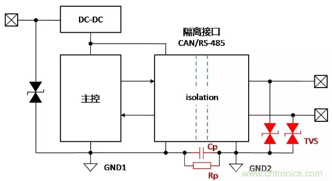 總線增加隔離固然可以保證總線穩(wěn)定可靠地通信,但是帶隔離通信接口的設(shè)備,在復(fù)雜的環(huán)境或安裝狀態(tài)下,接口會表現(xiàn)出完全不同的ESD特性,了解ESD對接口的影響機(jī)理,才能有針對性地增加保護(hù)器件,提升隔離接口的ESD能力。下面以帶有隔離CAN或RS-485通信接口為例,對常見的設(shè)備狀態(tài)下,ESD的作用機(jī)理進(jìn)行分析,并提出相應(yīng)的改善措施。