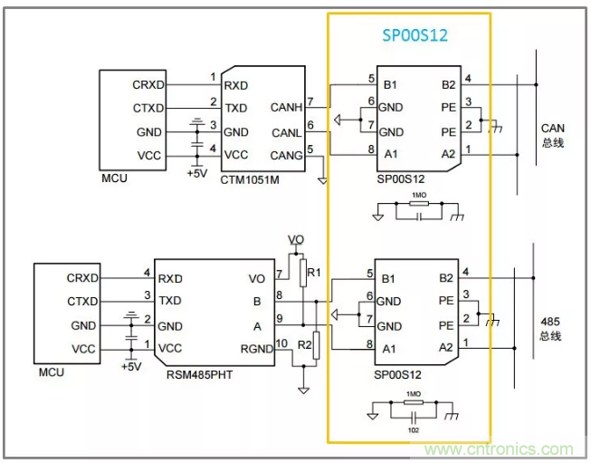另一種方案則是采用ZLG的SP00S12浪涌保護(hù)模塊,可用于各種信號傳輸系統(tǒng),抑制雷擊、浪涌、過壓等有害信號,對設(shè)備信號端口進(jìn)行保護(hù)。搭配ZLG的全隔離CTM或SC系列的隔離CAN收發(fā)器,如下圖。可極大程度的提升產(chǎn)品的集成度,于此同時極大程度的縮小開發(fā)周期。