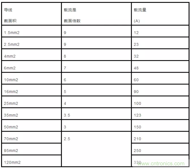 嚴(yán)格要求就用導(dǎo)線截面積乘以4作為載流量。載流量小,導(dǎo)線就要得多,成本就高。為了降低成本,又保證安全,很多家裝在不是封閉布線時(shí)就采用導(dǎo)線截面積乘以5倍或者6倍來提高導(dǎo)線的載流量。