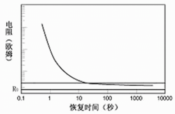 高分子PTC熱敏電阻由于電阻可恢復(fù),因而可以重復(fù)多次使用。圖6為熱敏電阻動作后,恢復(fù)過程中電阻隨時間變化的示意圖。電阻一般在十幾秒到幾十秒中即可恢復(fù)到初始值1.6倍左右的水平,此時熱敏電阻的維持電流已經(jīng)恢復(fù)到額定值,可以再次使用了。一般說來,面積和厚度較小的熱敏電阻恢復(fù)相對較快;而面積和厚度較大的熱敏電阻恢復(fù)相對較慢。