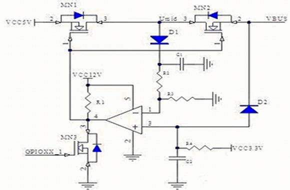即當VBUS大于3.3(R2+R3)/ R2 + UD1時,比較器便會將MOS管關斷。