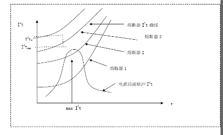 在這里,我們重點(diǎn)分析第(1)點(diǎn)。實(shí)際選用的熔斷器的I^{2}t_{F}值,即相應(yīng)于電流浪涌I2tmax最大值處的熔斷器的I2t值, 應(yīng)該滿足: