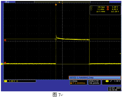 短路情況:多次短路測試發(fā)現(xiàn)保護IC(MM3177)能很好的起到短路保護作用,短路延遲時間11.4 ms。短路其短路電流情況如圖7(多次測試發(fā)現(xiàn)每次短路延遲時間變化微小,取其中較大的一次),此時測試到短路電流為16.4A。