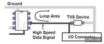 幅射噪音與受射頻信號影響的問題可以透過盡可能縮減由高速資料與接地線所形成的迴路區(qū)大小來降低,一個(gè)解決迴路區(qū)最小化問題的有效方法是在印刷電路板設(shè)計(jì)上加入接地面,特別是在走線長度相對較長時(shí),雖然將TVS元件與晶片間的距離盡量加大可以提供隔離,但卻可能增加回路區(qū)的面積大小,請參考(圖三)。