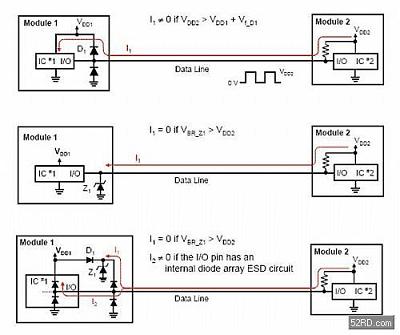 突崩式TVS二極管雖然擁有高突波規(guī)格,但相對較大的電容值使得這類元件成為負(fù)載切換開關(guān)與直流電源匯流排保護(hù)應(yīng)用的較佳選擇,相反地,二極管陣列適當(dāng)?shù)耐徊ㄒ?guī)格與較小的電容值則較適用于高速資料連接線的保護(hù),突崩式TVS與二極管陣列通??梢越换ナ褂?,但部份電路在選擇適合採用的元件時(shí)則需要經(jīng)過仔細(xì)的分析。(圖四)描述了當(dāng)存在一個(gè)電流可以透過資料線流經(jīng)二極管陣列路徑時(shí)所發(fā)生的向后驅(qū)動(dòng)問題,如果VDD2大于VDD1,那么資料連接線有可能意外地提供電源給模組1,這個(gè)情況可能會造成邏輯晶片的電源啟動(dòng)問題,或是在斷電后模組1上指示燈被點(diǎn)亮的異常狀況。