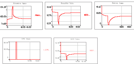 當(dāng)EPS工作時(shí),下圖描繪了上述電路引起的PowerNet瞬態(tài)波動(dòng)。注意:當(dāng)電力分配網(wǎng)絡(luò)穩(wěn)定時(shí),交流發(fā)電機(jī)提供給電池的最初充電電流。[page]