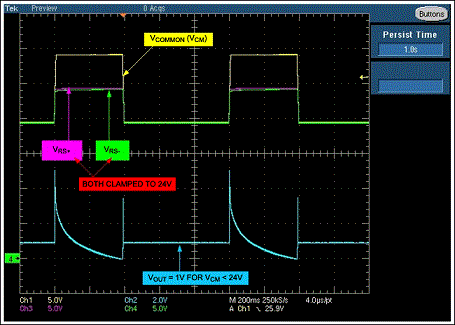 圖2是當(dāng)移走D1時,35V拋負載脈沖下放大器的輸出。施加電壓為電池標(biāo)稱電壓,所要求的輸出電壓為1V (輸入VSENSE = 50mV、增益 = 20)。出現(xiàn)拋負載電壓時,齊納管把輸入共模電壓鉗位在大約24V,放大器輸出經(jīng)過幾個短暫的波動后穩(wěn)定到0V。