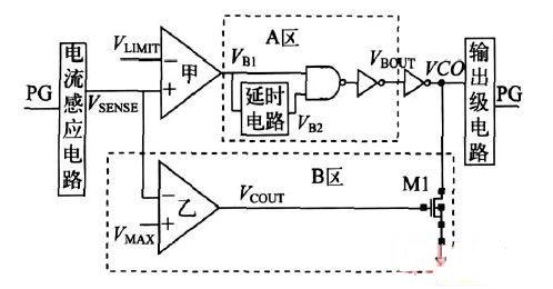 圖3 是改進(jìn)前后的過(guò)流保護(hù)電路圖。不加虛框部分是傳統(tǒng)的“中斷”模式過(guò)流保護(hù)電路,由電流感應(yīng)電路、比較電路以及輸出級(jí)電路組成。電流感應(yīng)電路采樣功率管電流。采樣得到的電流和限制電流ILIMIT 分別轉(zhuǎn)化為比較器的兩輸入端電壓VSENSE 和VLIMIT 并進(jìn)行比較,得到VCO。VCO作用于輸出級(jí)電路以控制功率管柵極電壓。如果負(fù)載過(guò)流,過(guò)流保護(hù)電路使得功率管柵極電壓PG 為高電平,強(qiáng)行使LDO中斷。