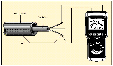 當(dāng)測(cè)試配線或電纜時(shí),應(yīng)將其從操作板或機(jī)器上斷開,保持隔離。應(yīng)該在電線或電纜之間或其和地之間進(jìn)行測(cè)量(參見第4頁(yè)的圖4)。IPCEA(Insulated Power Cable Engineers Association)提供下列公式,推薦了最小的絕緣電阻值。 R = K x Log10 (D/d) 表10. 電纜絕緣電阻 R -每1000 英尺 (305 米)電纜的阻抗,單位為MΩ?;?00伏特的DC測(cè)試電壓,在15.6?C (60?F)的溫度下通電1分鐘。 K-絕緣材料常數(shù)(例如,絕緣浸漬紙-2640, 漆包布鉛皮-2460, 熱塑聚乙烯材料-50000,合成聚乙烯-30000)