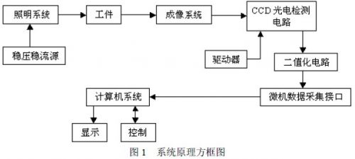 整個檢測系統(tǒng)由照明系統(tǒng)、被測工件系統(tǒng)、成像物鏡、CCD 光電檢測系統(tǒng)和計算機測控系統(tǒng)(8031 單片機和8279 鍵盤/顯示芯片等)構(gòu)成。穩(wěn)壓穩(wěn)流調(diào)光電源為遠心照明系統(tǒng)提供穩(wěn)定的照明光,被照明的工件經(jīng)成像物鏡成像在線陣CCD 的光敏陣列面上。由于工件不透光,工件的像在中間部分形成暗帶,兩側(cè)形成亮帶。 暗帶的寬度就是工件尺寸所成像的大小。線陣CCD 在驅(qū)動脈沖的作用下完成光電轉(zhuǎn)換并產(chǎn)生視頻信號。其系 統(tǒng)原理圖如圖1。
