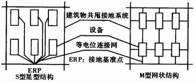 (4)等電位保護(hù)。電子設(shè)備的機(jī)柜機(jī)架、金屬外殼、金屬管槽、屏蔽線纜外層、信息設(shè)備的防靜電接地端、安全保護(hù)接地端、浪涌保護(hù)接地端等,在同等電位連接網(wǎng)絡(luò)的接地端子相連接時,均需采用最短的距離??刂葡到y(tǒng)的等電位連接,通常分為“S型星型結(jié)構(gòu)”以及“M型網(wǎng)狀結(jié)構(gòu)兩種”,其中在控制系統(tǒng)中設(shè)備較少或者進(jìn)行局部控制時通常采用S型星型結(jié)構(gòu),而在相對較大的控制系統(tǒng)中則采用M型的網(wǎng)狀結(jié)構(gòu)。等電位連接的基本方式如圖3所示。
