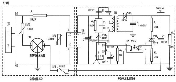 為了實(shí)現(xiàn)上述目的所采取的設(shè)計(jì)方案是:將壓敏電阻和陶瓷氣體放電管的單相并聯(lián)式抗雷擊浪涌電路應(yīng)用到儀表的電源上。主要分為防雷電路部分和開關(guān)電源電路部分,電路簡單,采用復(fù)合式對稱電路,共模、差摸全保護(hù),可以不分L、N端連接。使壓敏電阻RV1位于貼片整流模塊前端分別與電源L、N并聯(lián),主要來鉗位L、N線間電壓,壓敏電阻RV0、RV2與陶瓷氣體放電管FD1串聯(lián)后接地,RV0與FD1串聯(lián)主要是泄放L線上感應(yīng)雷擊浪涌電流,RV2與FD1串聯(lián)主要是泄放由信號口串人24V參考電位上的能量,RV0、RV2短路失效后,F(xiàn)D1可將其與電源電路分離,不會導(dǎo)致失火現(xiàn)象。