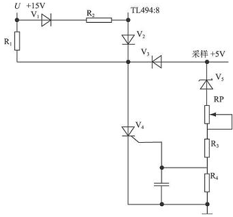 工作原理: 數(shù)控開關(guān)電源由輔助電源+ 15 V 提供給可控硅V4管陽(yáng)極工作電壓, 實(shí)際輸出取樣電壓送至穩(wěn)壓管V5 , 當(dāng)超出保護(hù)電壓閾值+ 5. 5 V 時(shí), 輸出電壓經(jīng)穩(wěn)壓管、電阻R3 、R4 分壓觸發(fā)可控硅V4 導(dǎo)通, 將輔助電源+ 15 V 通過(guò)電阻R1接地, 同時(shí)通過(guò)二極管V2切斷8 腳電源。調(diào)節(jié)RP 電位器, 可以對(duì)輸出電壓保護(hù)閾值點(diǎn)進(jìn)行設(shè)置?! ?br />