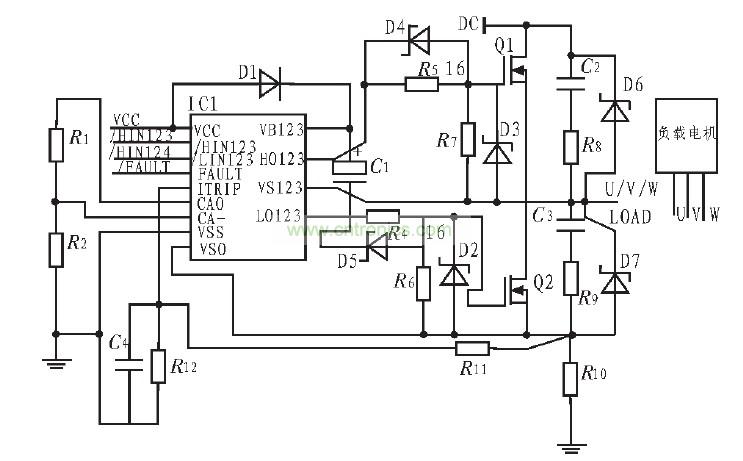 圖3是由IR2130組成的無(wú)刷直流電機(jī)驅(qū)動(dòng)原理圖為便于表示只畫出其中一個(gè)橋臂的電路示意圖,通過IR2130輸入信號(hào)控制MOSFET的開關(guān),由此驅(qū)動(dòng)無(wú)刷直流動(dòng)機(jī)。C1是自舉電容,為上橋臂功率管驅(qū)動(dòng)的懸浮電源存儲(chǔ)能量,D1的作用是防止上橋臂導(dǎo)通時(shí)母線電壓倒流到IR2130的電源上而使器件損壞,因此D1應(yīng)有足夠的反向耐壓,當(dāng)然D1與C1串聯(lián)也是為了滿足主電路功率開關(guān)頻率的要求,D1應(yīng)選快速恢復(fù)二極管。 R1、R2、R10、R11、R12、C4組成過流檢測(cè)電路。R5、R6為柵極驅(qū)動(dòng)電阻,D4、D5為功率管提供了一個(gè)低阻抗的放電回路,使功率管能夠快速的泄放電荷。