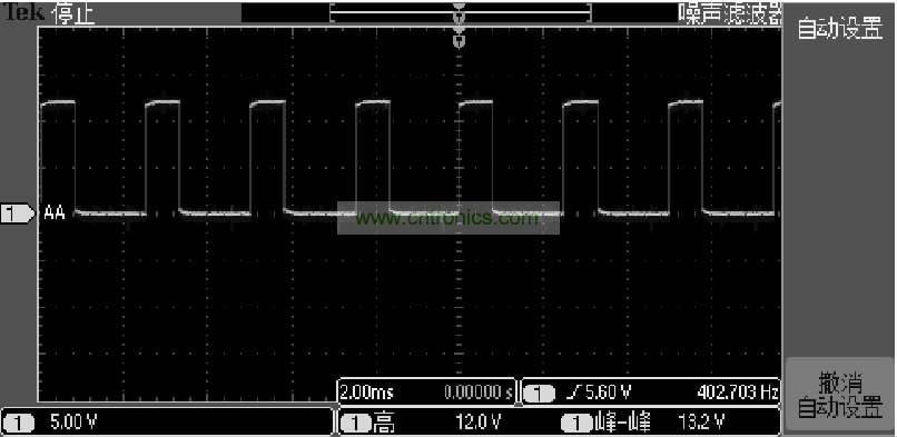 在實(shí)際應(yīng)用中柵極的驅(qū)動(dòng)波形如圖4所示,此波形是在電機(jī)3000RPM時(shí)的驅(qū)動(dòng)波形,可以看出此波形完全能夠滿足要求,同時(shí)進(jìn)行了短路、電機(jī)堵轉(zhuǎn)等試驗(yàn),圖3電路也能過很好地保護(hù)功率MOSFET管。