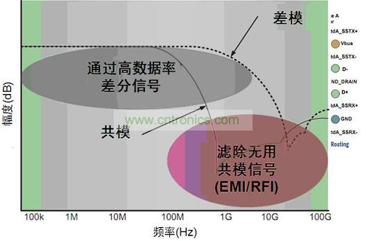 這些應(yīng)用中能使用共模濾波器(CMF)來(lái)消除不想要的共模噪聲,并防止高速信號(hào)輻射有害的共模噪聲信號(hào)至系統(tǒng)其它元件。同時(shí),CMF還使想要的高速數(shù)據(jù)事實(shí)上不受影響地通過(guò)。典型的CMF特性如圖4所示,圖中顯示消除了共模噪聲,同時(shí)支持差模信號(hào)無(wú)損通過(guò)。