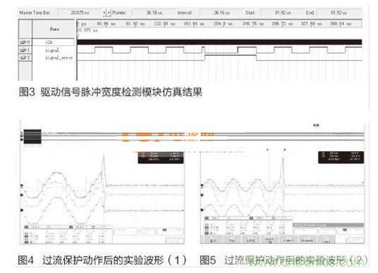 電路實現(xiàn):在CPLD中設(shè)置預(yù)先設(shè)定的計數(shù)門限值,即驅(qū)動信號高電平或者低電平持續(xù)的最大計數(shù)值;對輸入的驅(qū)動信號的高電平或者低電平持續(xù)計數(shù),將采樣得到的單位計數(shù)值與預(yù)置的門限計數(shù)值進行比較,如果計數(shù)值小于或者大于預(yù)先設(shè)置的值,則檢測模塊輸出閉鎖信號,切斷驅(qū)動信號輸出模塊的信號輸出,完成驅(qū)動信號的高電平脈沖寬度檢測;同時,模塊將驅(qū)動信號進行反相邏輯轉(zhuǎn)換,然后再檢測轉(zhuǎn)換后形成的高電平脈沖寬度,這樣,實現(xiàn)驅(qū)動信號的低電平的脈沖寬度檢測。