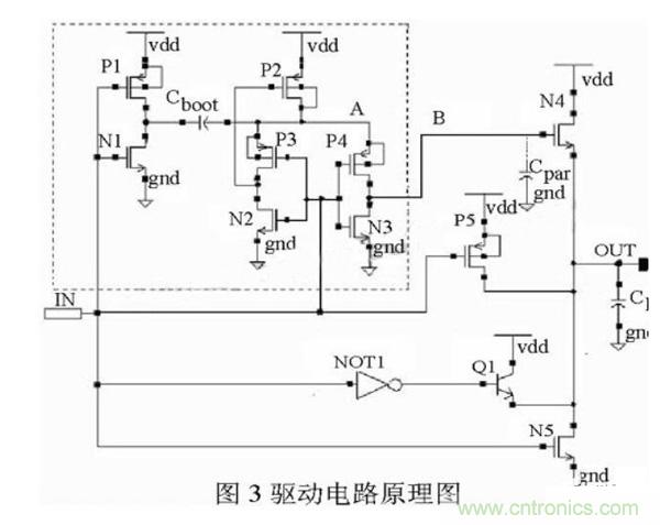 圖3中給出了驅(qū)動電路的電路圖。驅(qū)動電路采用Totem輸出結(jié)構(gòu)設(shè)計,上拉驅(qū)動管為NMOS管N4、晶體管Q1和PMOS管P5。下拉驅(qū)動管為NMOS管N5。圖中CL為負(fù)載電容,Cpar為B點的寄生電容。虛線框內(nèi)的電路為自舉升壓電路。