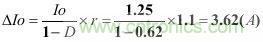 假設(shè)已知連續(xù)工作模式的反激變換器,其輸出電流Io為1.25A,紋波率r為1.1,占空比D為0.62,開關(guān)頻率為60kHz,由此可以計(jì)算次級(jí)紋波電流ΔIo和有效值電流Io.rms。