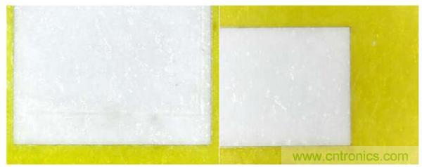 圖2.紫外激光 PI 膜開窗(左圖為 0.5mil 厚,右圖為 1mil厚)